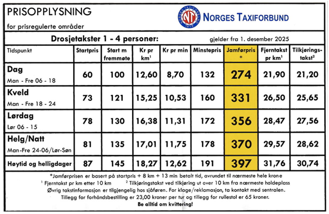 Det tilkommer pristillegg på 25% med passasjerer fra 5 til 6 personer.